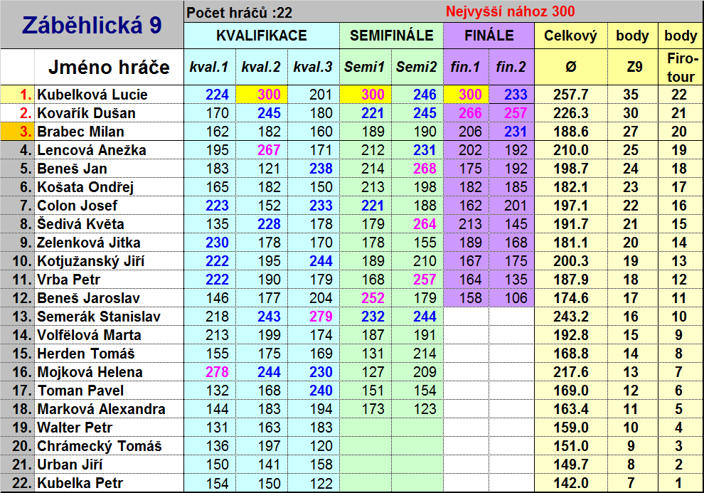 V neděli 23.11. se konal předposlední turnaj série Záběhlické devítky. Stejně jako minule si přišlo zahrát 22 bowlerů a tak o postup do semifinále bylo třeba bojovat. Nečekaný byl nepostup stálého účastníka série Jirky Urbana. Kvalifikaci s přehledem vyhrála Helena Mojková s krásným náhozem 752. Nejvyšší nához ale už v kvalifikaci ukořistila Lucka Kubelková a to rovných 300, za který si její táta odnesl prémiovou cenu HRABAL SEKT brut od sponzora nejvyššího náhozu vinařství Hrabal. Za celý den si ji pak zopakovala ještě dvakrát!!